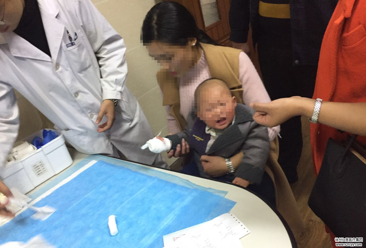 11月6日上午9点,徐州仁慈医院手外科三病区的病房走廊内,一位老奶奶怀中抱着满脸泪痕的孙子小宝哄着,一岁的小宝小小的右手上包裹着一层又一层纱布,身旁的年轻女子正给小宝的手指贴胶带,她是小宝的妈妈。