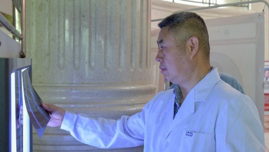 徐永清教授也为足踝患者诊治。这是一家三口,母亲和弟弟陪着40多岁的哥哥前来,大半年前哥哥遭遇严重车祸,去年9月植骨,在宿州的医院做的手术,现在左膝关节一点使不上劲,用手拍有“哐哐哐”的声响。徐教授观察了他间隔大半年的两张片子,判断:“骨折端可见肥大骨痂生长,考虑内固定不稳定,从三个月的X片上看,已经有骨痂生长了,口服促进骨折愈合药物,观察三个月,如仍没有变化,可在骨折端辅助钢板,增加骨折稳定,促进骨折愈合。”