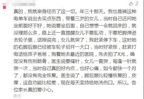 跟林林同一病房的坤坤(化名),今年也才3岁10个月,孩子是奶奶带他外出时受伤的。当时,坤坤坐在奶奶的电动车后座上,奶奶听到孩子的大哭声才停下来,发现孩子的右脚已经卷进了后轮,拉不出来,一群热心的路人上前帮忙,硬把孩子的右脚从后轮里拽了出来(其实,这个动作是非常错误的!),孩子右脚面一大块皮肤软组织被蹭掉,哭得撕心裂肺。