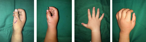 当然,先天性重复拇指畸形的形态并不是单一的,而是形态各异。它有主次型:主干拇指、赘生指;也有镜像型:两个大小几乎相等;还有龙虾钳型:两个拇指形态几乎相同,伴有指间关节、掌指关节侧屈、掌屈、成角,形类似龙虾钳。越复杂的形态,手术治疗的难度越大,需要手术的次数也越多。