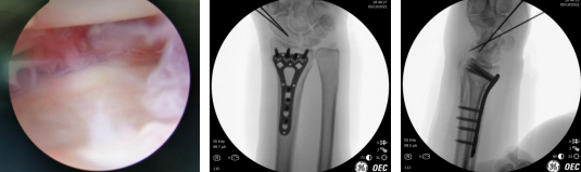 当天,齐伟亚主任手术团队为患者李阿姨进行了“关节镜辅助下左桡骨远端骨折复位内固定术+舟骨骨折复位内固定术”。关节镜辅助下复位桡骨远端骨折端,在左腕掌侧做一1.5公分的切口,放置1块金属接骨板,C臂透视见骨折对位、对线良好,关节镜再次探查,见关节面对位平整,依次对位缝合修复皮下组织。闭合复位左舟骨,术中透视见骨折对位、对线良好,内固定在位。手术顺利。
