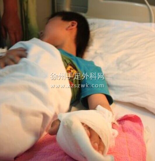 7月3日上午,徐州仁慈医院手外科主任石荣剑向媒体介绍,孩子左手掌为旋切伤,掌侧有约5厘米的开放性伤口,伤口较深,肌腱、神经、血管损伤较重,左手食指骨折,伤口深达骨头,伤势较严重,随后医生为其进行了3个小时的清创修复手术和再植手术,非常成功。由于送医及时,预计孩子康复后,手功能基本可以恢复正常。目前,小宝的恢复情况很好,但这个暑假的一半时间他要在医院度过了。