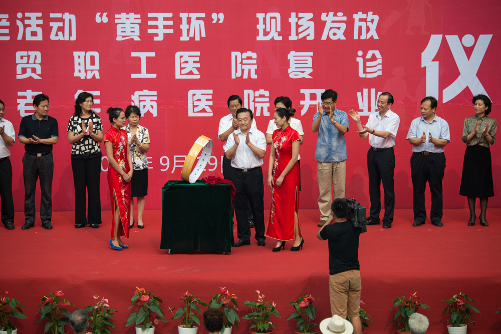 徐州市公益助老活动“黄手环”现场发放暨徐州仁慈老年病医院开业、徐州市财贸职工医院复诊仪式于9月19日隆重举行,徐州市人大副主任周建洪、副市长冯兴振、市政协副主席陈萍等市领导为第一批老人带上充满关爱的“黄手环”。